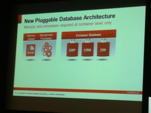 Самой интересной возможностью предстоящего релиза базы данных, на мой взгляд, является фича под названием Pluggable Database. В свете современных трендов IaaS, PaaS, SaaS и прочих облачных технологий, возможность логического объединения в рамках одной платформы нескольких баз данных, без изменения самих приложений — это здорово. Если у вас есть приложения, которые не могу жить совместно в рамках одного инстанса, а такое возможно, если, например приложение состоит из нескольких схем, использует публичные синонимы, или в процедурах, функциях и пакетах есть жесткая привязка к названиям схем, то на данный момент, единственный вариант консолидации — это поднятие нескольких инстансов на одном физическом сервере. А каждый экземпляр оракла требует выделение памяти под SGA, PGA, ресусов CPU, I/O и так далее. Чем больше инстансов на одной машине — тем чаще будет происходить смена контекста CPU процессов, тем больше нужно памяти под каждый инстанс, хотя по большому счету SGA у всех инстансов будет содержать примерно одно и то же. Смысл в Pluggable DB в том, что на сервере запускается один инстанс, а вот баз данных может быть сколько угодно, и каждая БД живет как будто она одна. Один инстанс — соответственно одна SGA, по одному DBWn, MMON, SMON, LGWRn и прочих процессов. Так же разделяется процесс администрирования. Есть администратор всего экземпляра, а есть администраторы каждой БД. Из дополнительных плюсов — это возможность легкой и быстрой миграции одной БД на другой сервер.