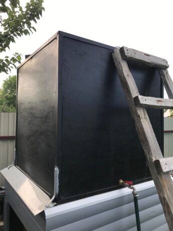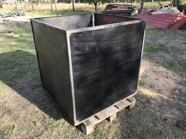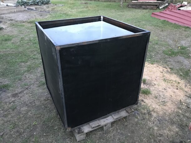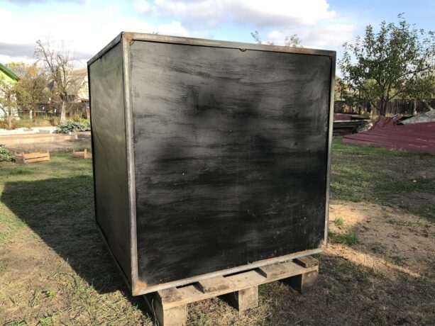 Куб получился шикарный! Он сварен из 2мм листового железа, рёбра усилены обычными 20-ми уголками, для надёжности все швы внутри промазаны герметиком, а чтобы железо не ржавело — всё покрашено изнутри и снаружи краской. Объём — 1 кубический метр 🙂 1м х 1м х 1м
