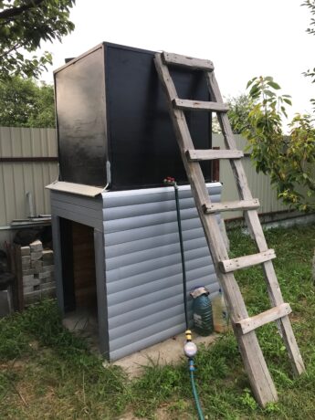 Поскольку в течение недели на даче никого нет, всё электричество так же выключается, то в качестве источника воды решено было использовать большую ёмкость на некотором возвышении над землёй, чтобы естественного давления воды хватало для полива.